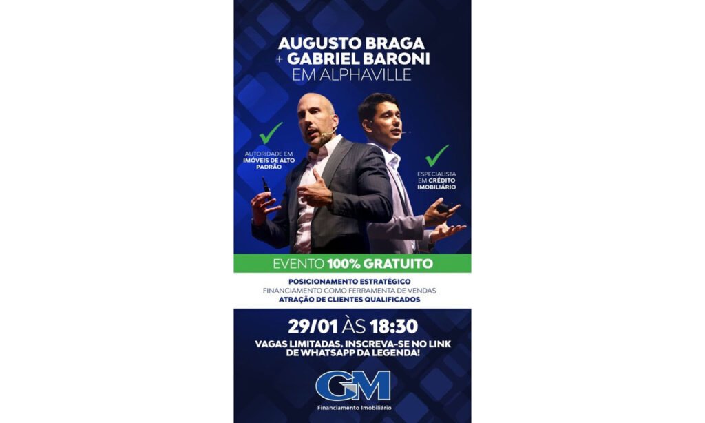 Treinamento exclusivo para profissionais do mercado imobiliario que desejam elevar seu posicionamento, atrair clientes qualificados e transformar o financiamento em uma ferramenta real de vendas. Com Augusto Braga e Gabriel Baroni.