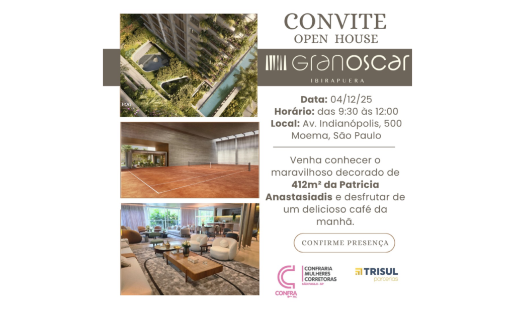 Open House para conhecer o empreendimento GranOscar Ibirapuera com 412m2 decorado por Patricia Anastasiadis e desfrutar de um delicioso Cafe da Manha. Evento exclusivo para Associadas da Confraria.